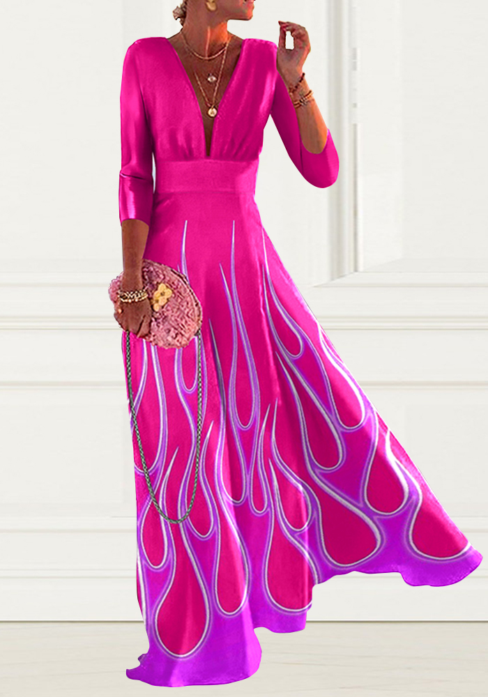 V Neck Flame Print Long Sleeve Maxi Dress
