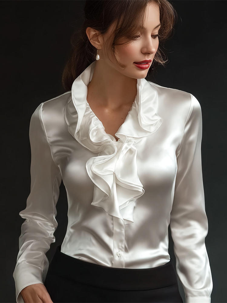 Elegant Ruffle Women's Satin Long Sleeve Blouse