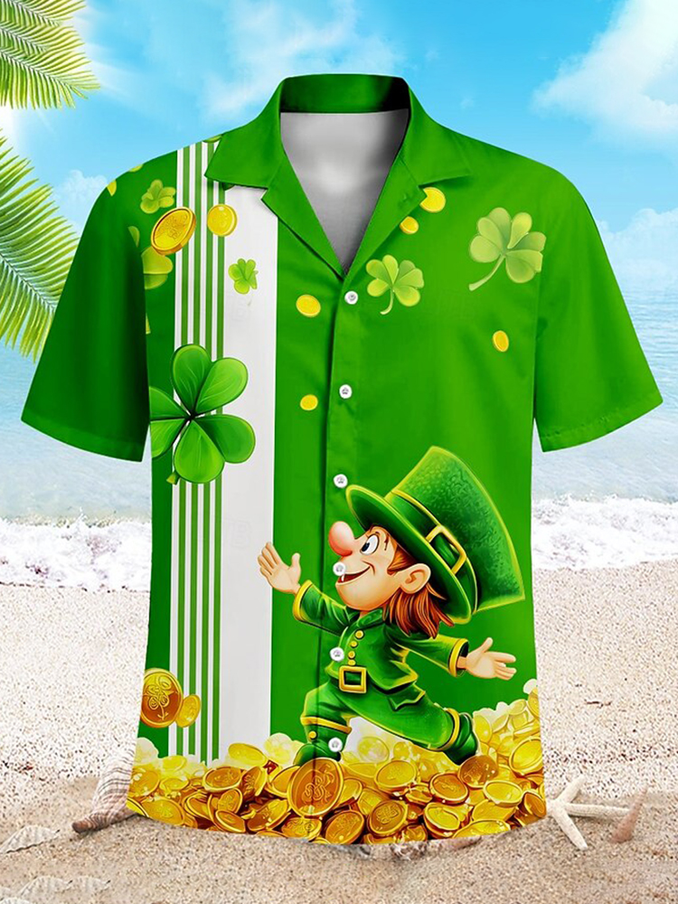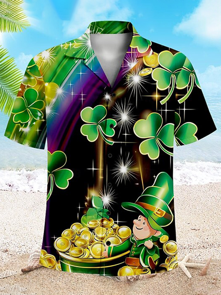 Men's Retro Shamrock Gold Coin Print Button Up Shirt