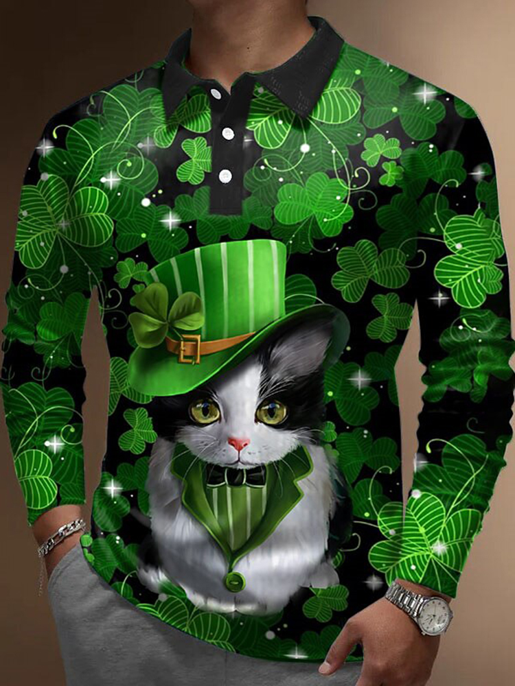 Men's Cat Saint Patrick Day Long Sleeve Polo Shirt