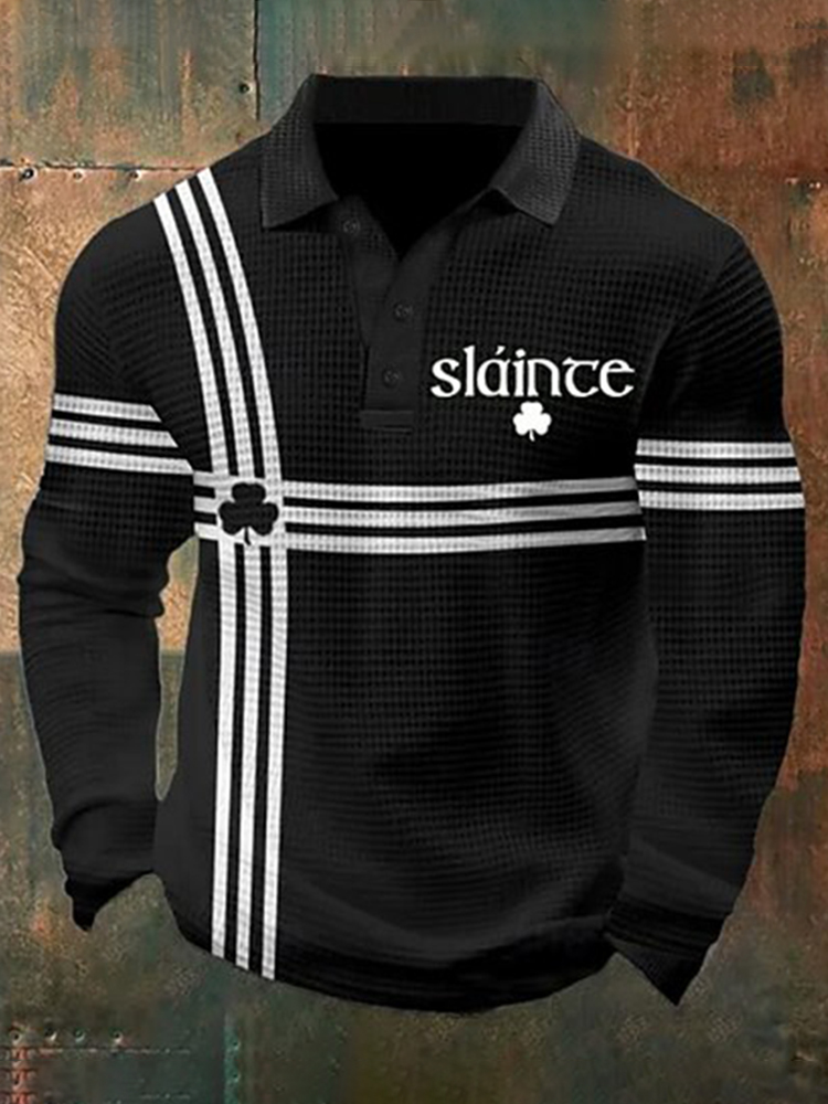 Men's Retro St Patrick's Day Shamrock Print Waffle Long Sleeve Polo Shirt