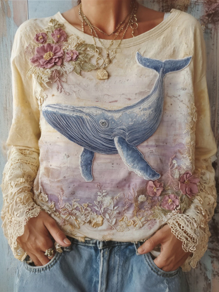 Women's Floral And Whale Embroidered Lace Linen Crew Neck T-shirt