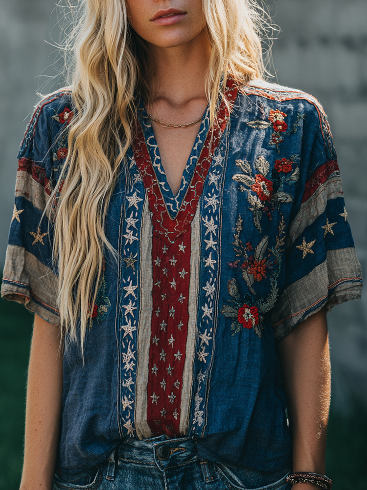 Vintage Boho Floral Patchwork V Neck Casual Tops