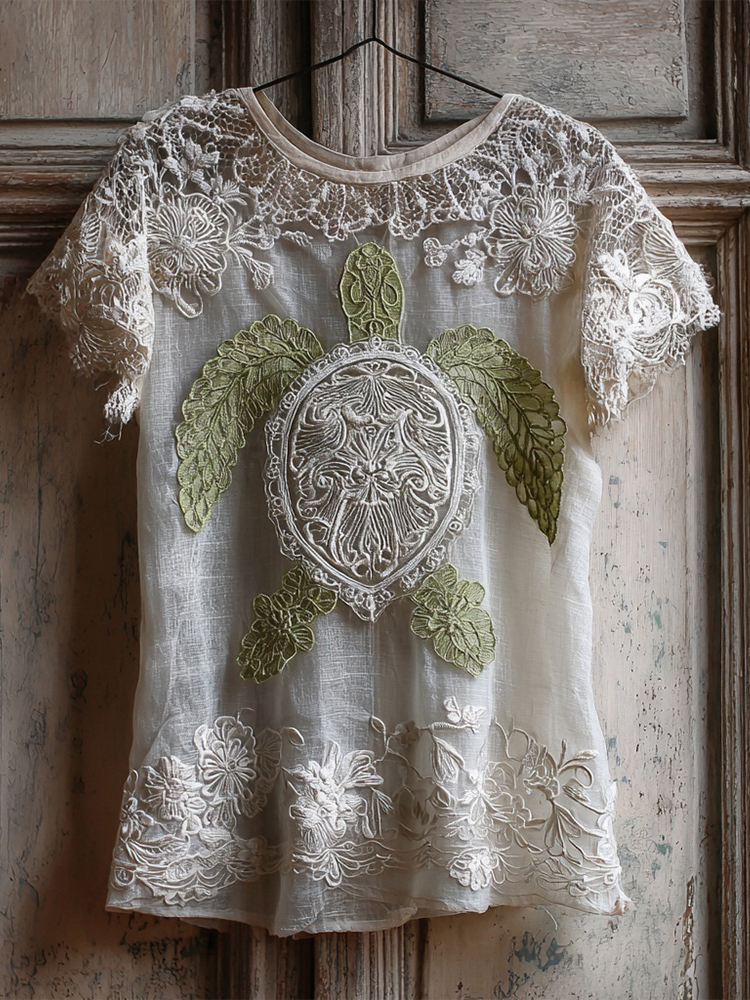 Retro Sea turtle Lace Embroidered Cozy Linen T Shirt