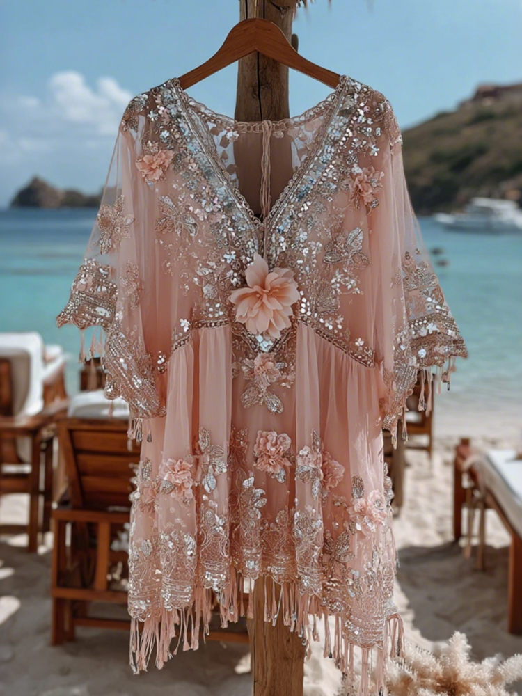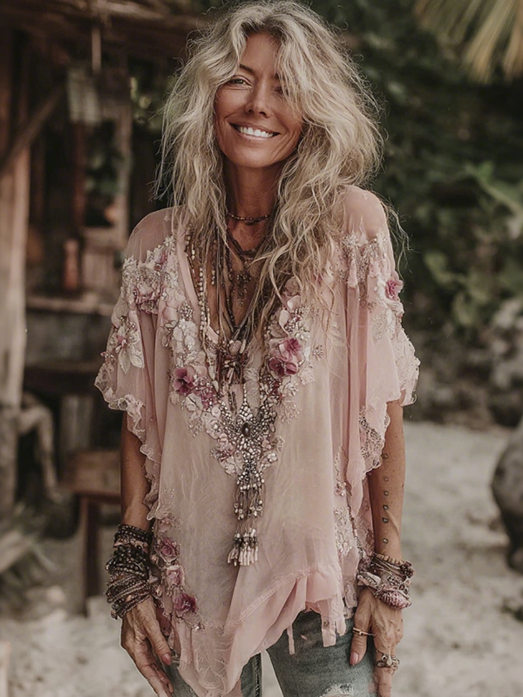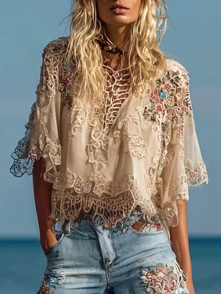 Boho Vintage Lace V-neck Cotton Blend Shirt