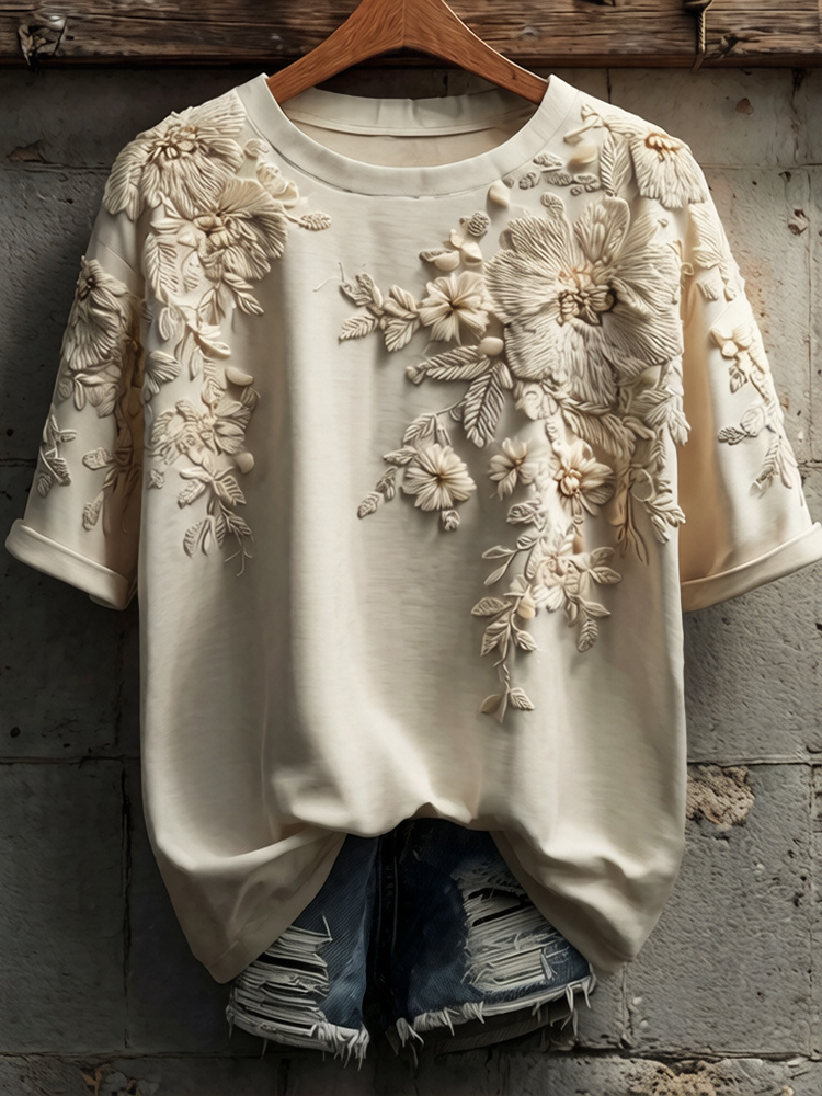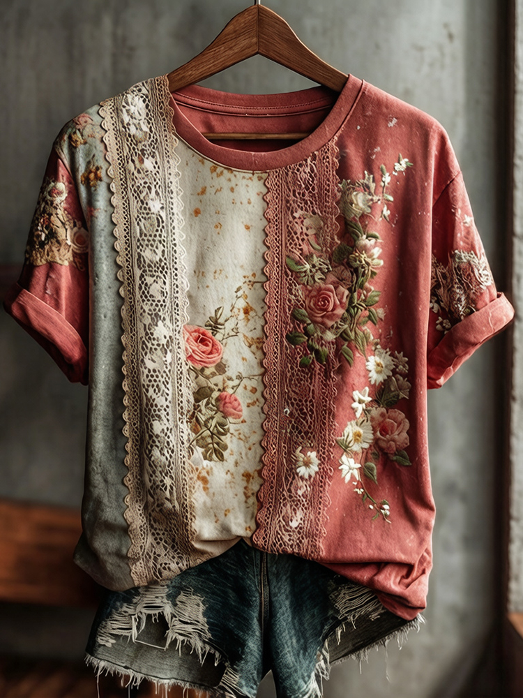Women's Retro Lace Floral Art Casual Short-sleeve T-shirt
