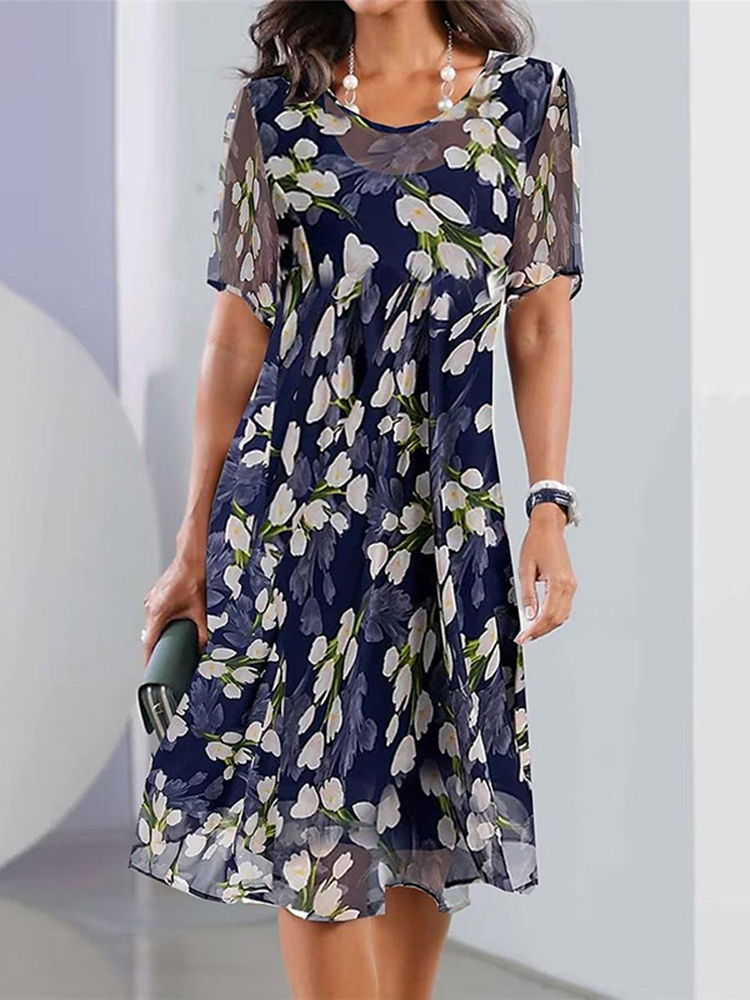 Elegant Flower Print Crew Neck Midi Dress