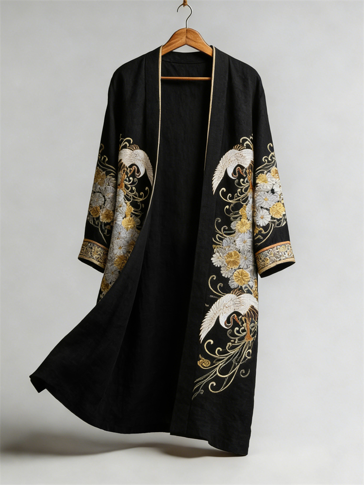 Japanese Cranes & Chrysanthemum Floral Flowy Linen Long Kimono