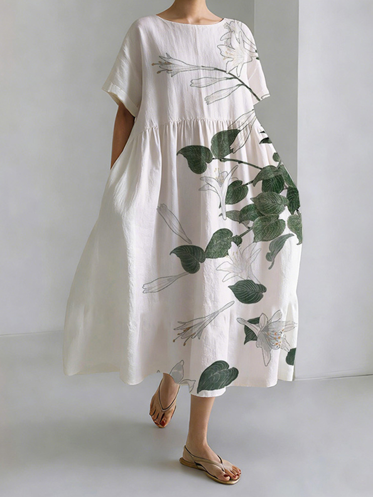 Lotus Flower Japanese Art Flowy Linen Midi Dress