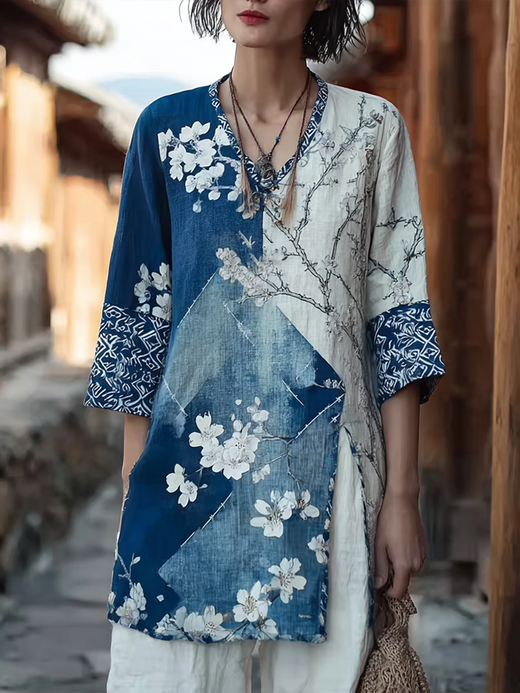 Japanese Art Retro Style Cherry Blossom Pattern Women's V-neck Top