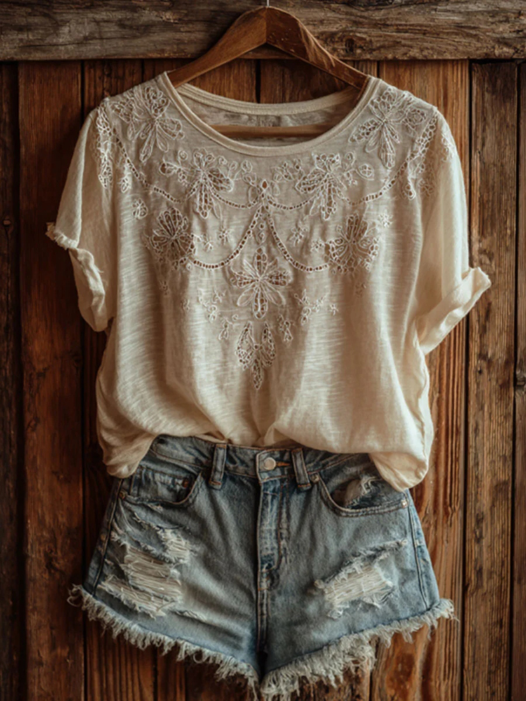 Women's Retro Lace Floral Embroidery Casual Short-sleeve T-shirt