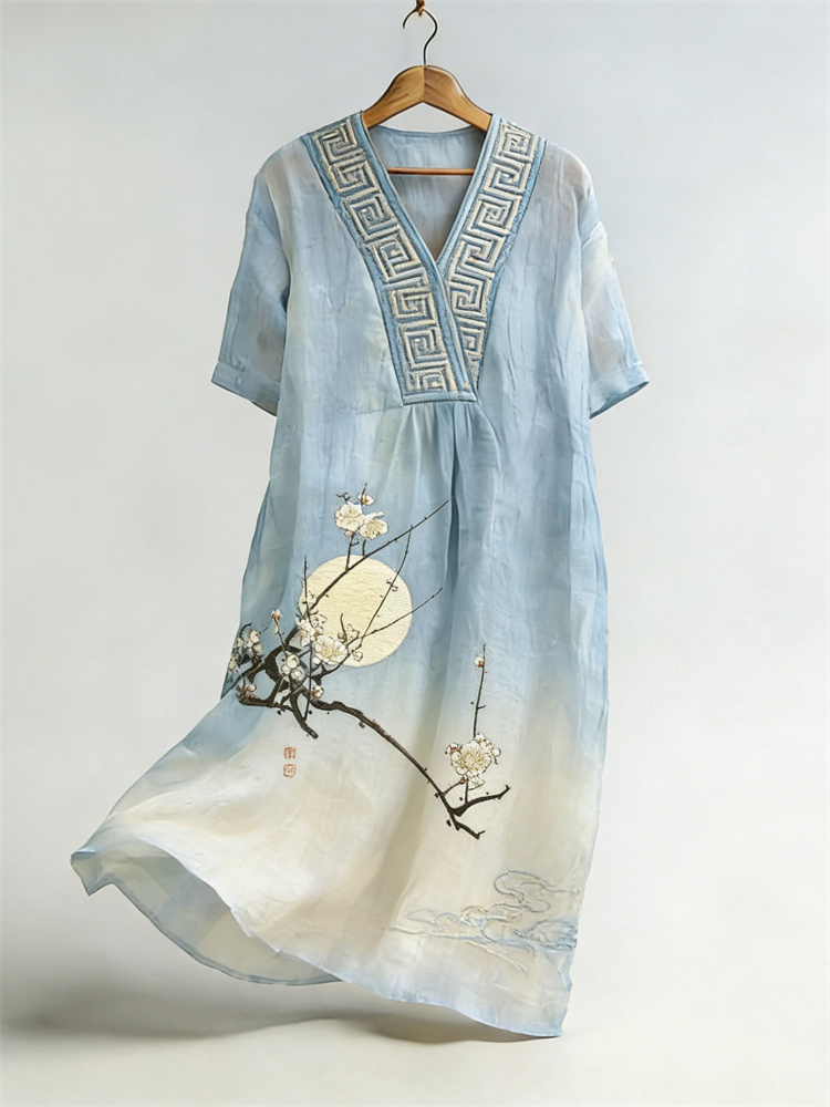 Japanese Plum Blossom Moon Gradient Flowy Linen Maxi Dress