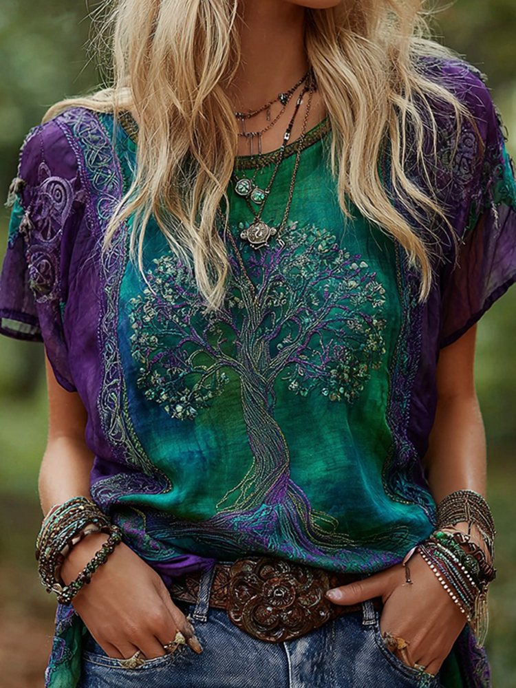 Women's Vintage Viking Tree Of Life Patchwork Casual Linen Crew Neck T-shirt