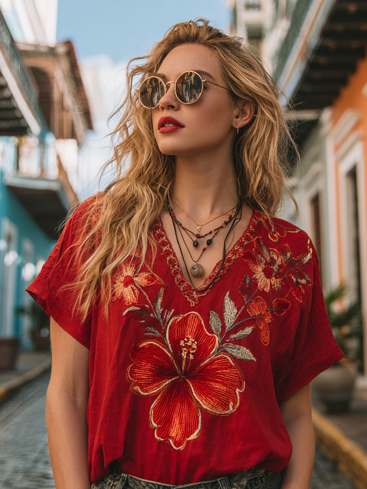 Women's Retro Hibiscus Pattern Casual Linen Blend T-shirt