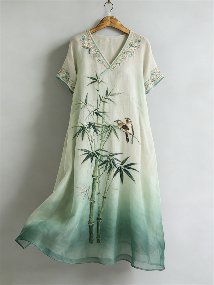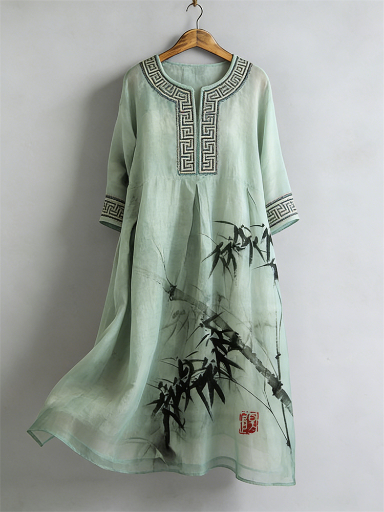 Classy Japanese Bamboo Art Flowy Linen Maxi Dress