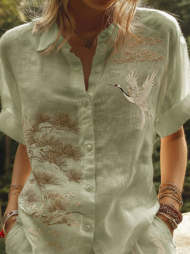 Women's Retro Japanese Pine Tree Art Pattern Casual Linen Shirt