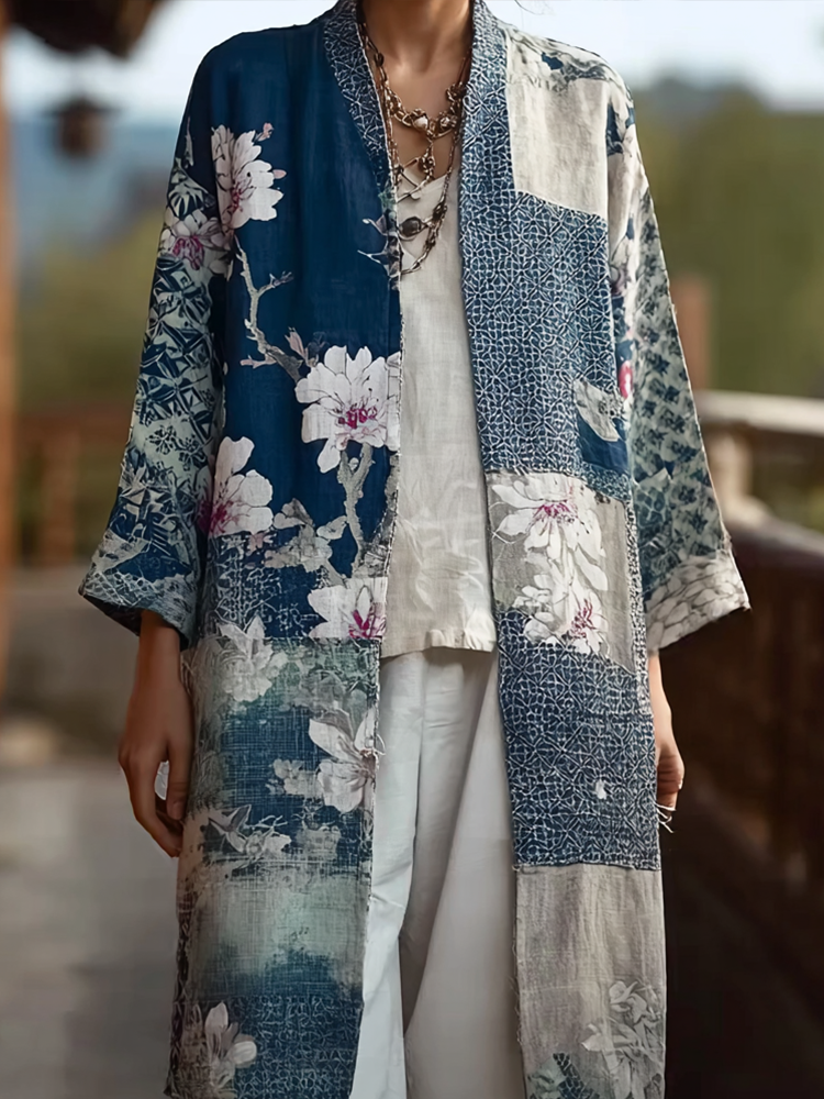 Japanese Art Retro Color Block Design Long Sleeve Cardigan