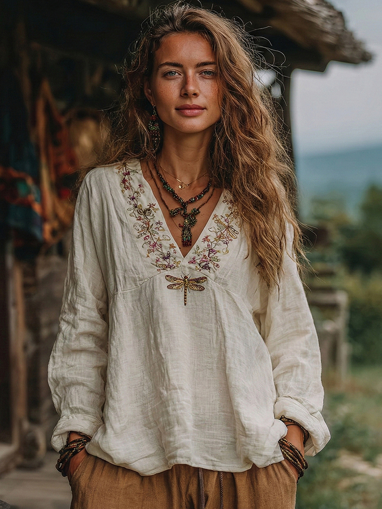 Women's Vacation Boho Floral With Dragonfly Print V-neck Linen Blend Tops