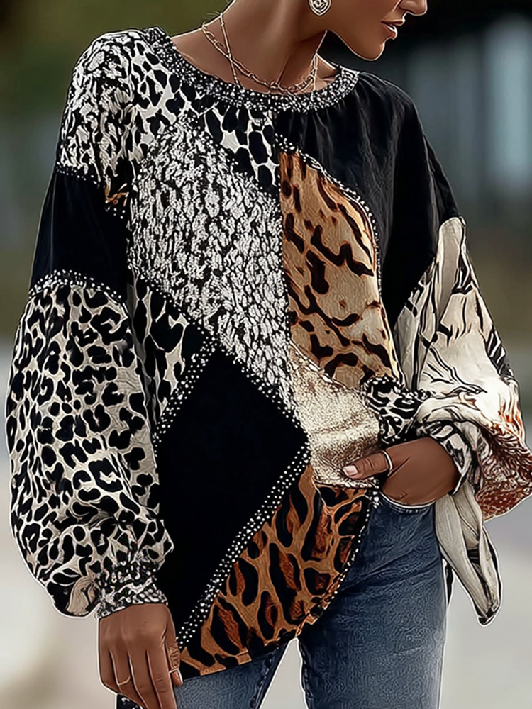 Vintage Leopard And Animal Patchwork Art Pattern Linen Blend Loose Round Neck Tops