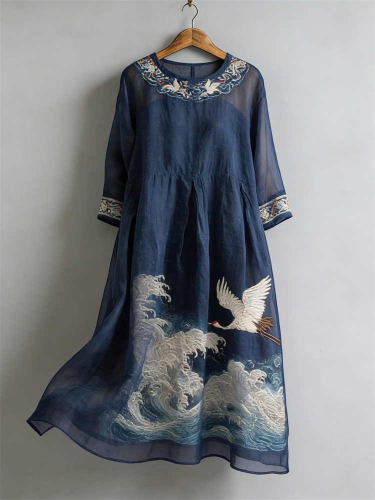 Cranes Sea Waves Japanese Art Flowy Linen Maxi Dress