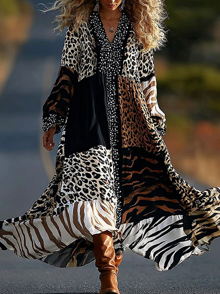 Retro Leopard And Animal Patchwork Art Linen Blend Loose Maxi Dress