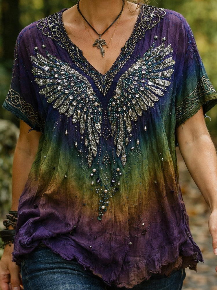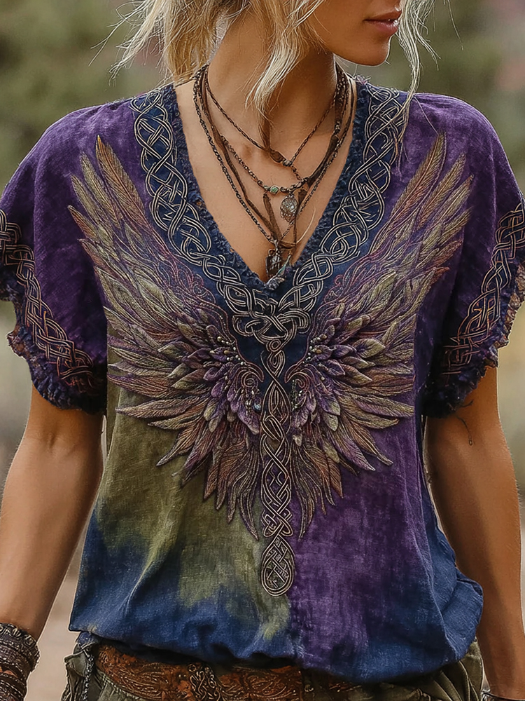 Women's Retro Viking Wings Gradient Art Linen T-shirt