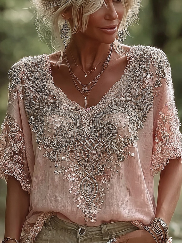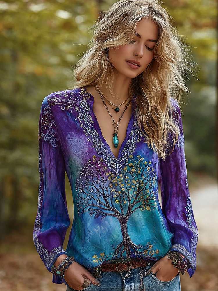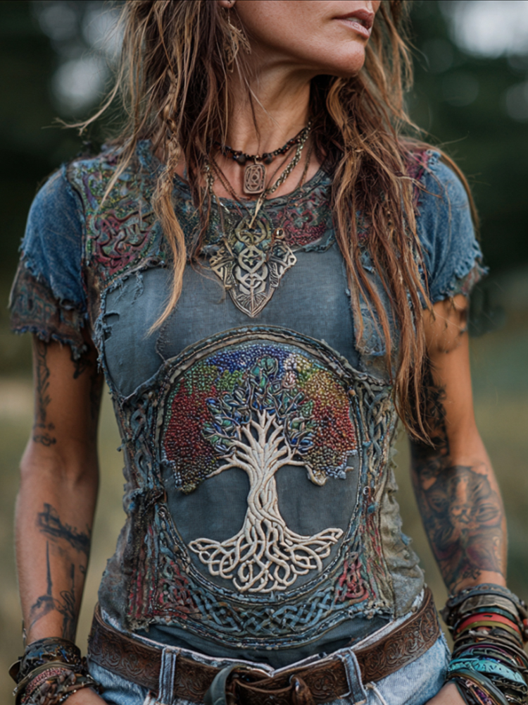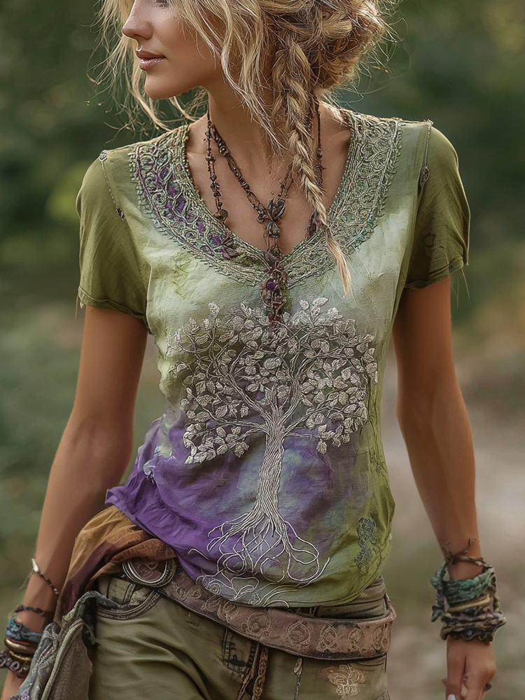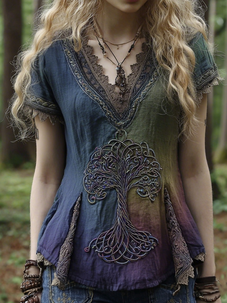 Women's Viking Style Tree Of Life Embroidery Lightweight Casual Top