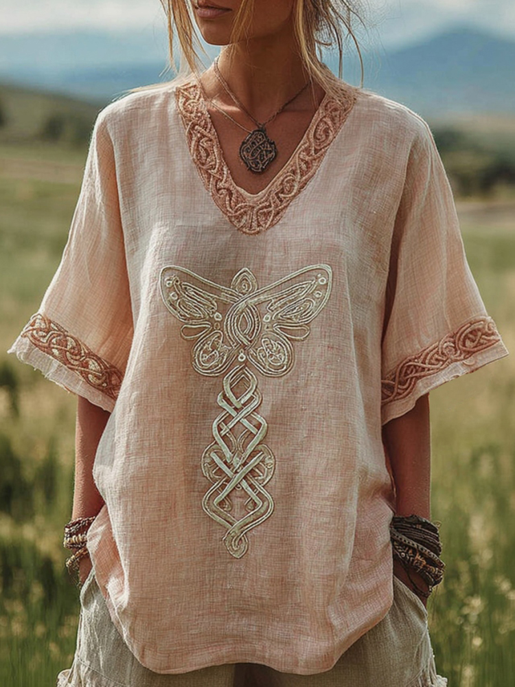 Women's Vintage Viking Tree Of Life Pattern Casual Linen V-neck T-shirt