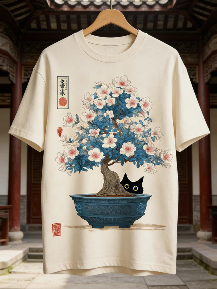 Men's Potted Plant Black Cat Print Casual T-shirt