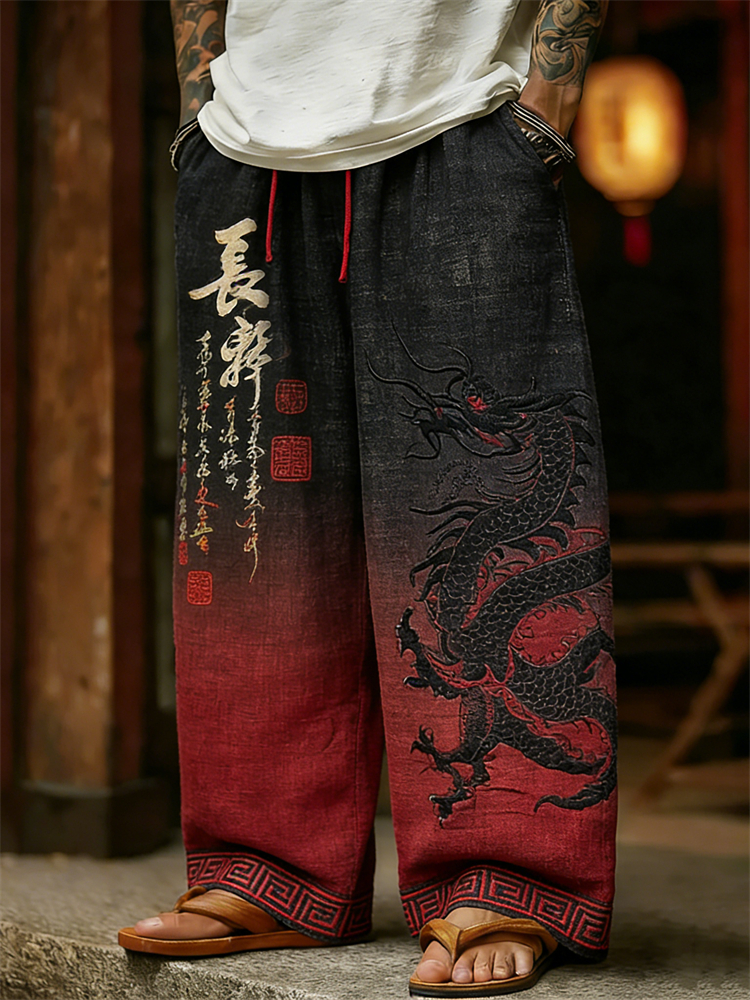 Men's Japanese Dragon Calligraphy Art Gradient Linen Pants