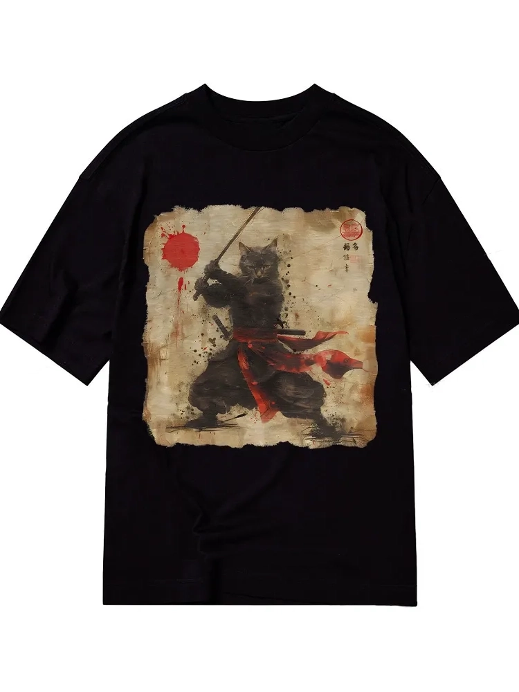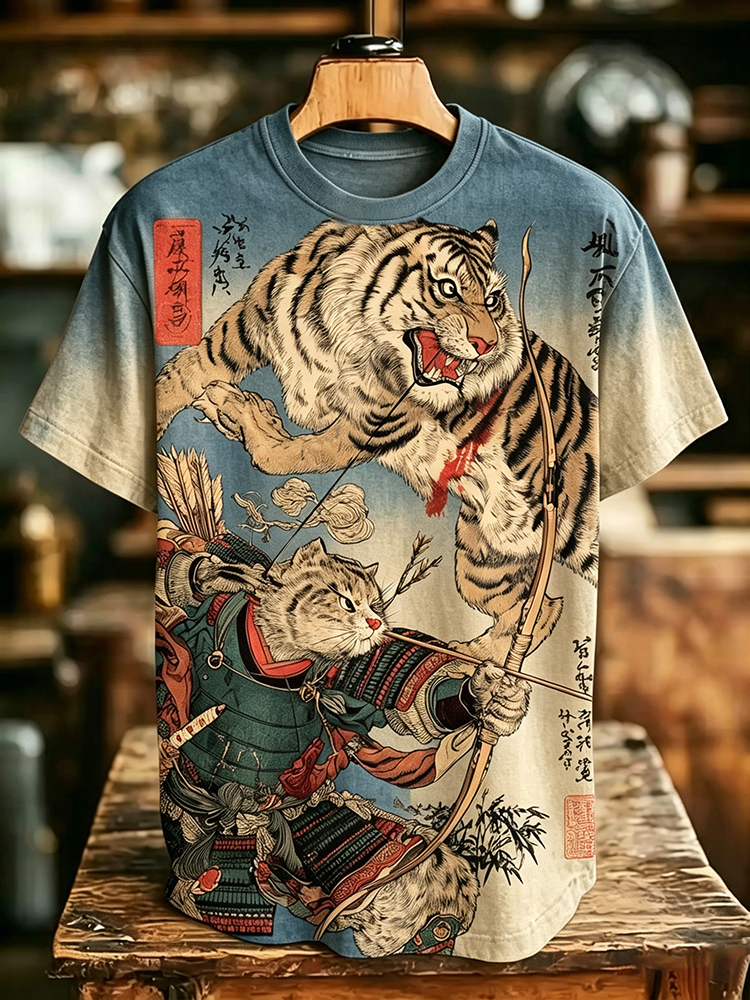 Men's Retro Japanese Cat And Tiger Pattern Crew Neck T-shirt