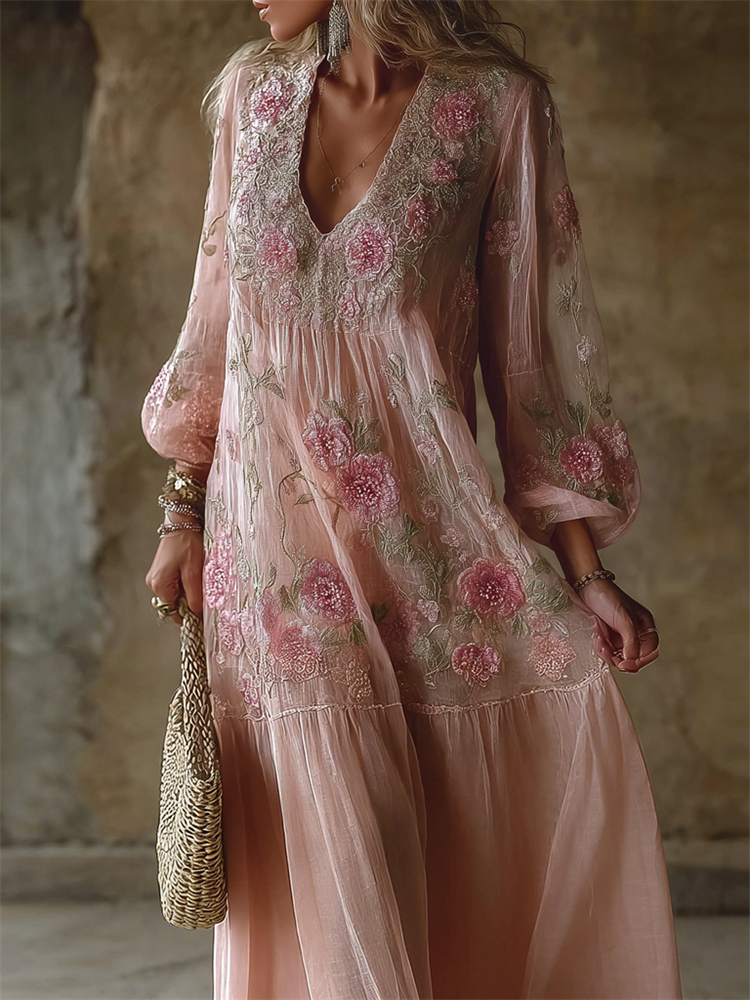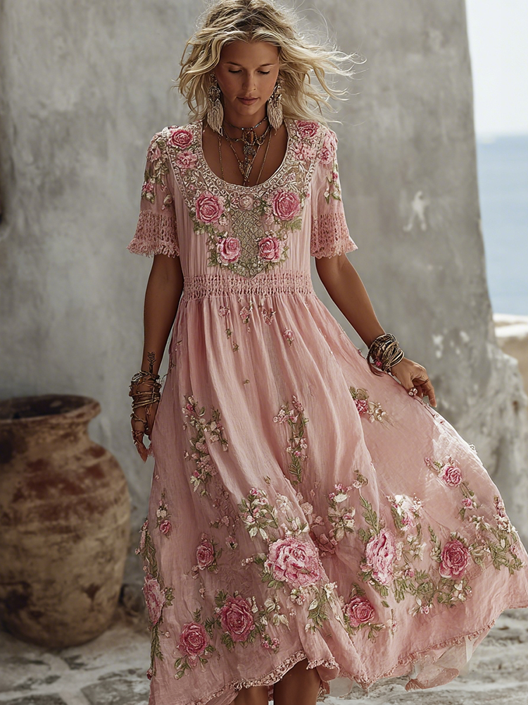 Boho Pink Roses Floral Embroidered Flowy Tiered Linen Maxi Dress