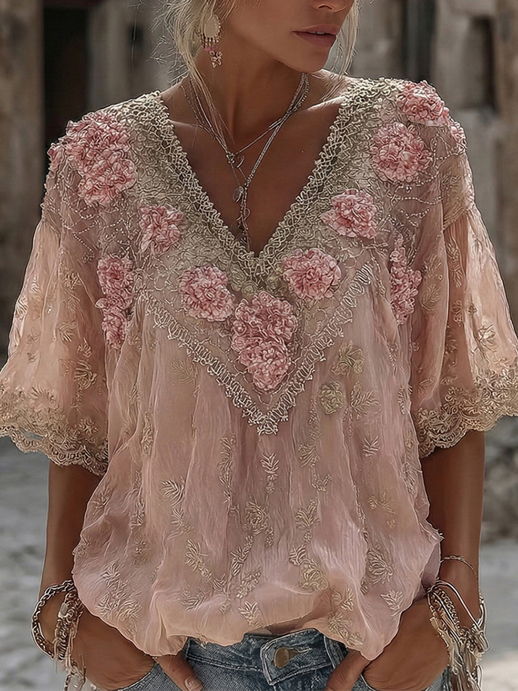 Women's Vintage Pink Floral Embroidered Art V-neck Linen Blend Blouse