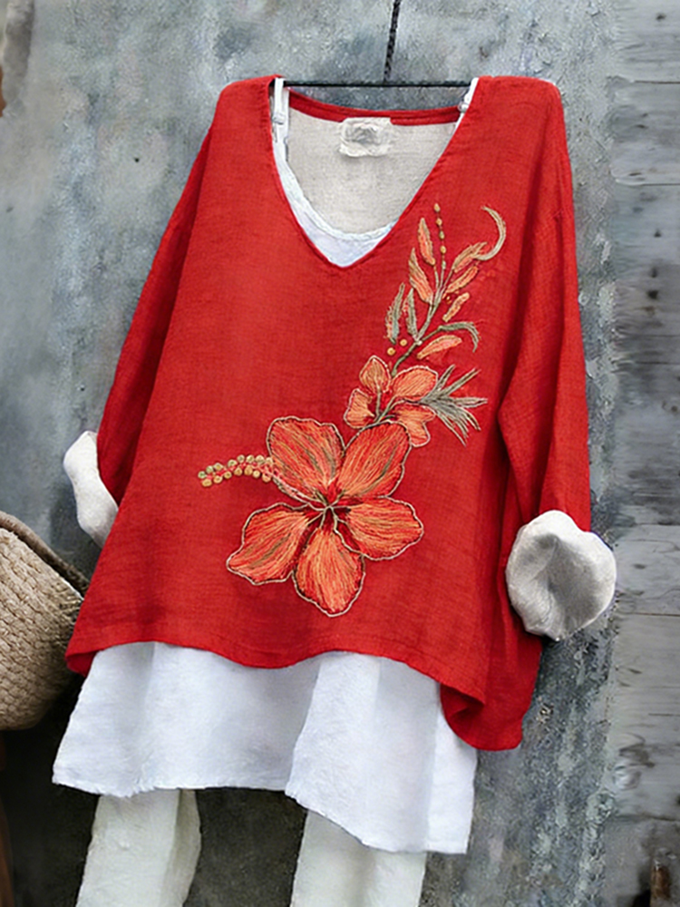 Women's Floral Art Pattern Linen Blend V-neck Shirt