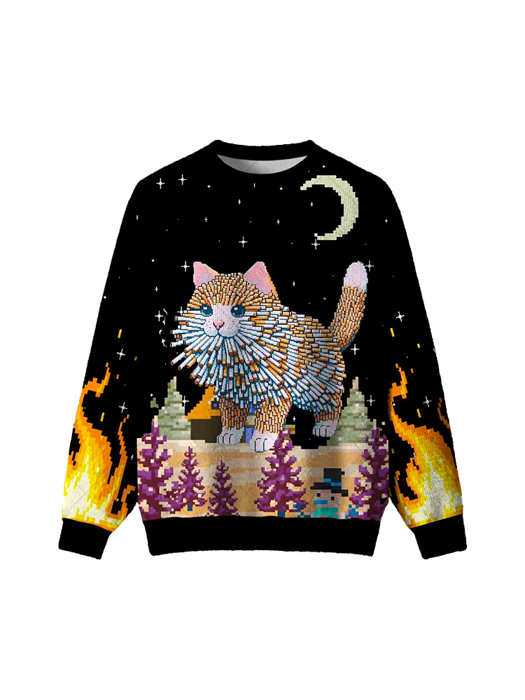 Pixel Flame Cat Ugly Christmas Sweatshirt