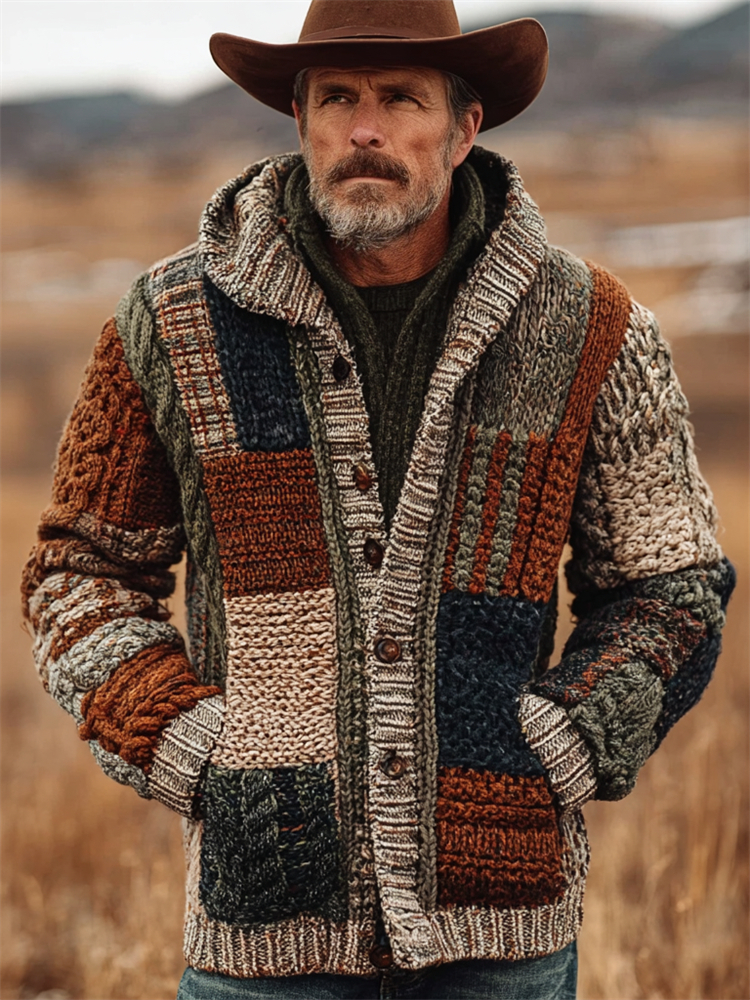 Men's Vintage Western Chunky Colorblock Knit Hooded Cardigan