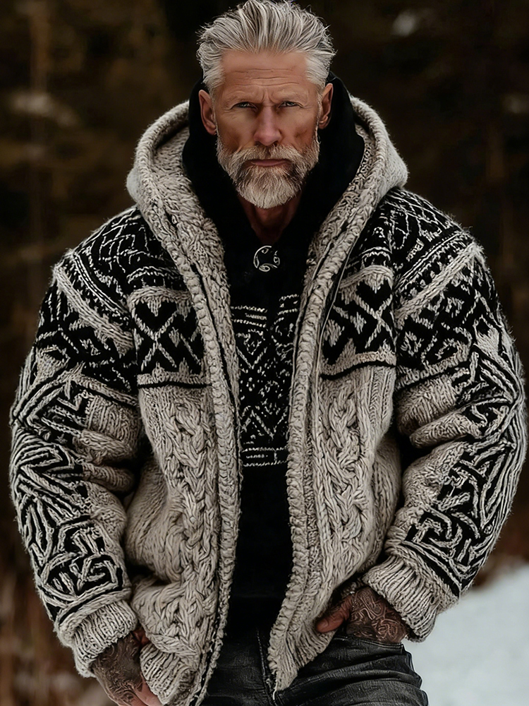 Men's Vintage Viking Wolf Celtic Jacquard Knitted Cozy Hooded Sweater