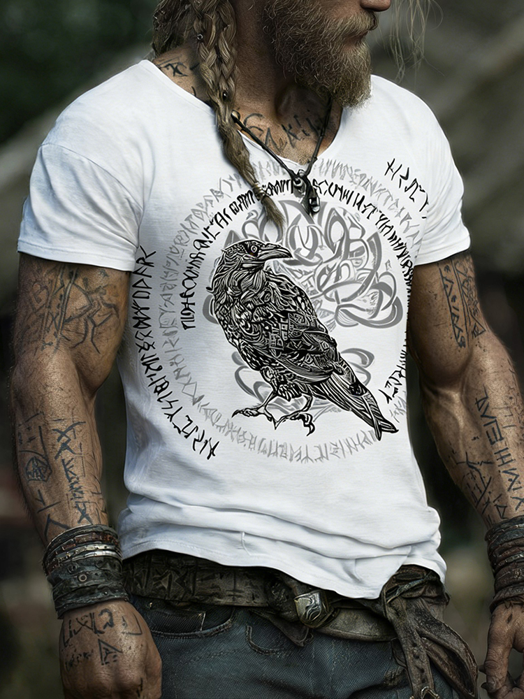 Men's Retro Viking Tree Of Life And Raven Rune Print V-neck T-shirt
