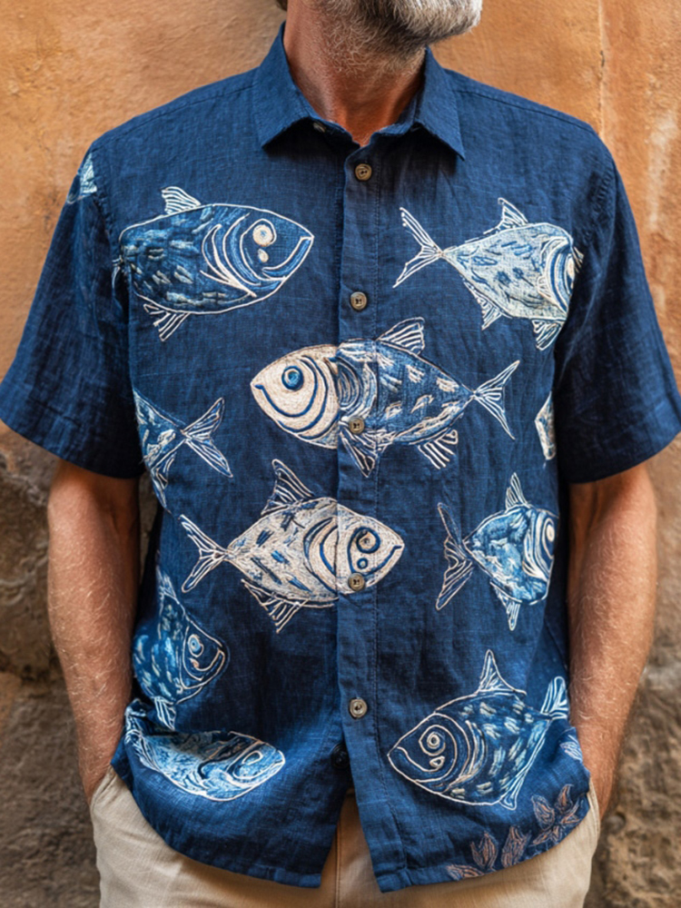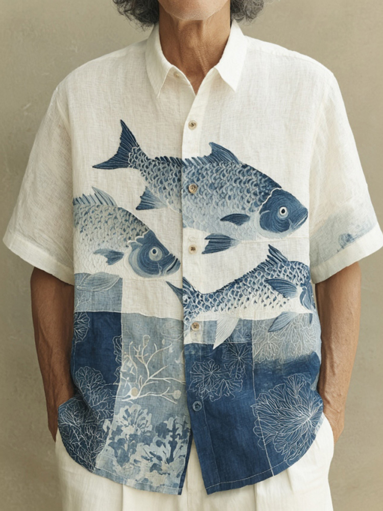 Men's Japanese-style Art Fish Print Short-sleeved Shirt