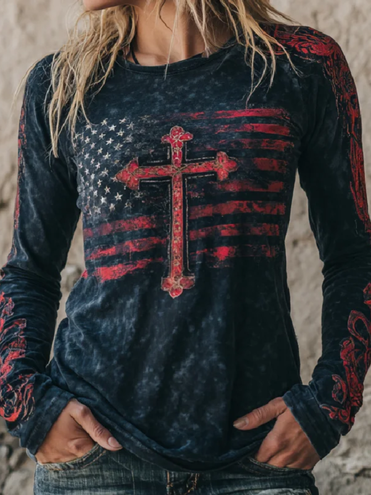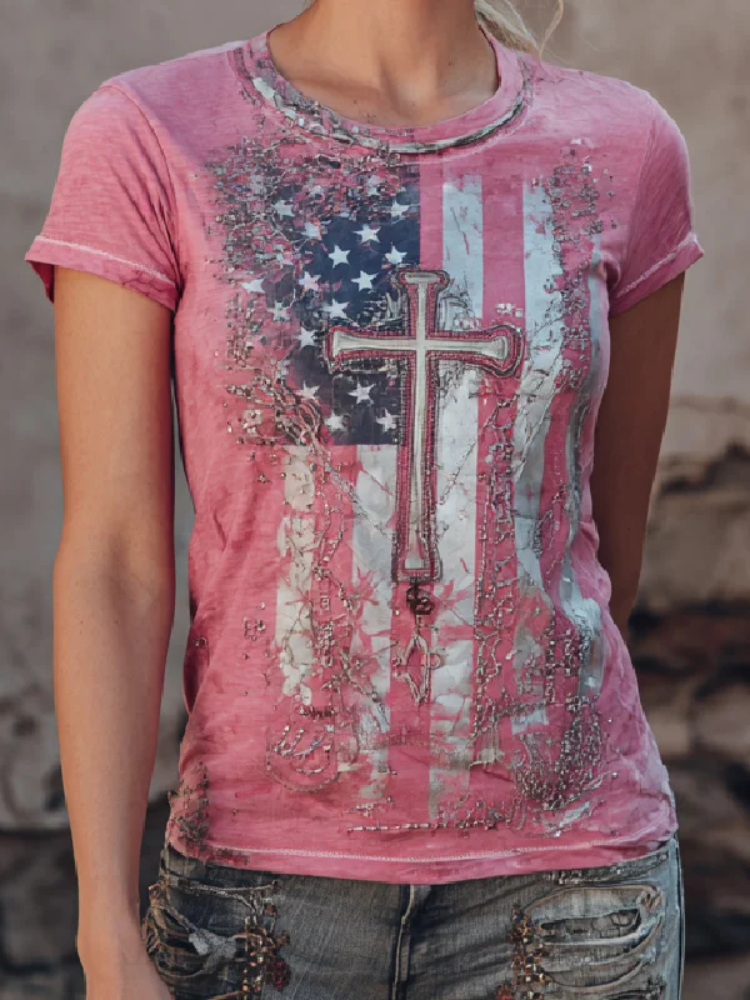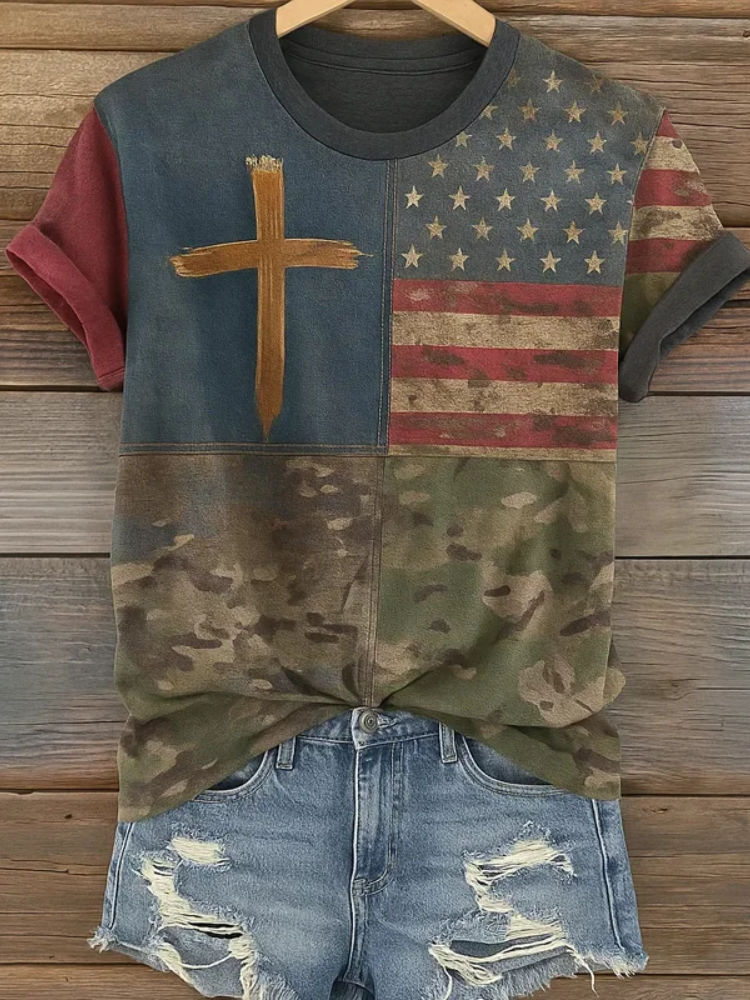 Retro Casual American Flag Cross Faith Top