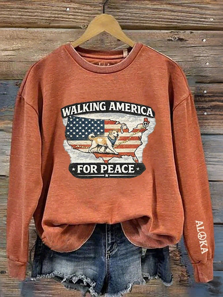 Retro Walking America For Peace With Aloka Dog Print Crew Neck Sweatshirt