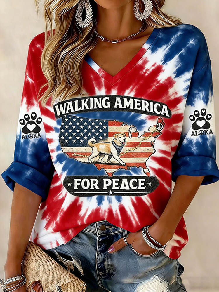 Retro Walking America For Peace With Aloka Dog Tie Dye Print V-neck T-shirt