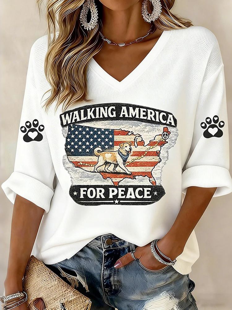 V-neck Retro Walking America For Peace With Aloka Dog Print T-shirt