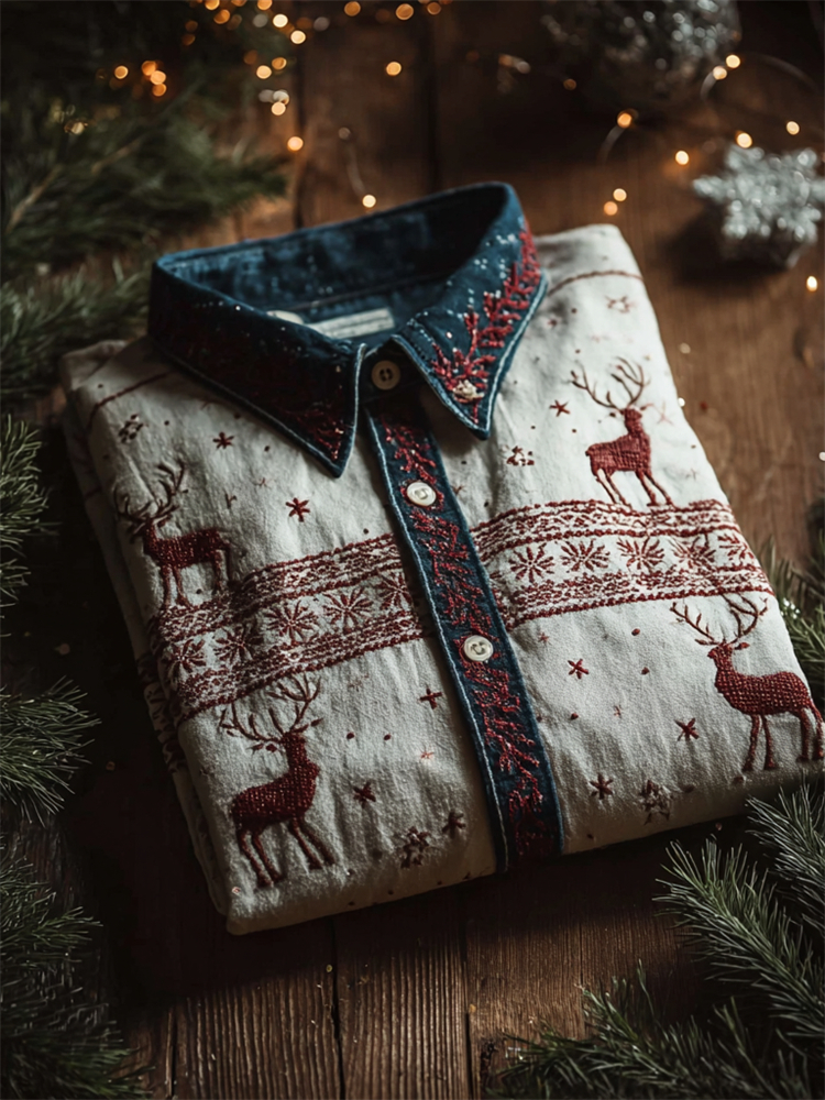 Cottage Christmas Reindeer Snowflakesembroidered Linen Shirt