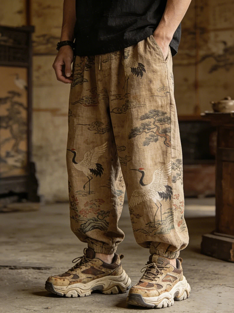 Men's Vintage Red-crowned Crane And Pine Japanese Art Print Casual Pants