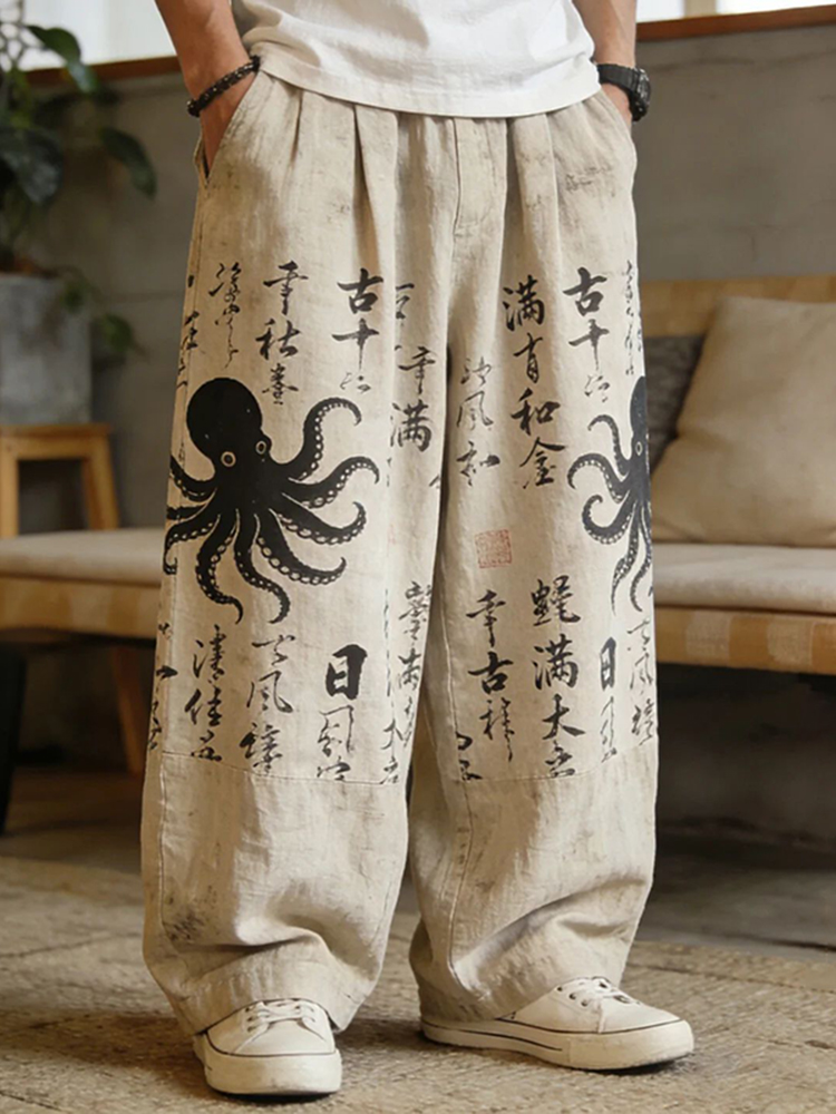 Men's Octopus Japanese Calligraphy Art Print Drawstring Waist Casual Pants