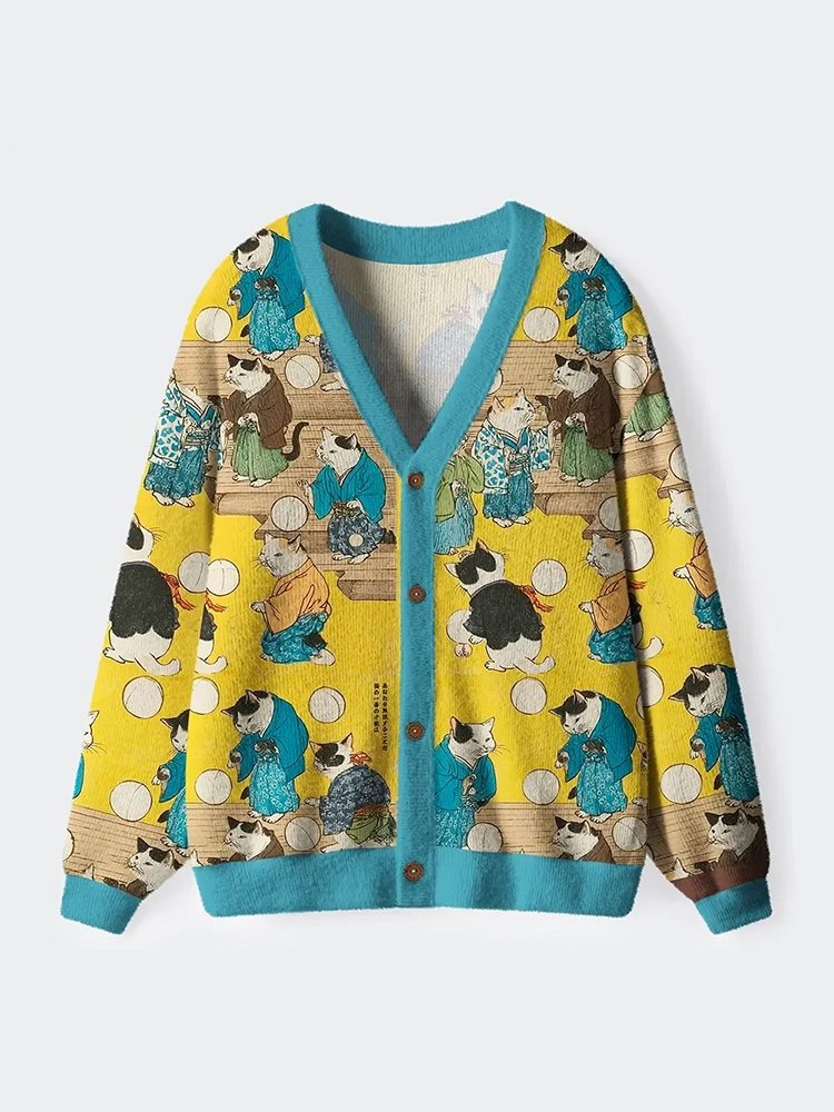 Japanese Abstract Art Cat Ugly Cardigan Sweater