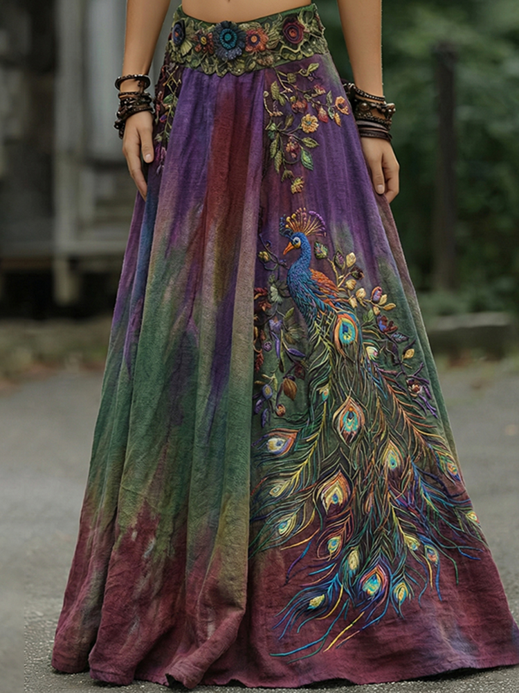 Vintage Classy Gradient Purple Peacock And Floral Embroidered Art Linen Blend Casual Skirt
