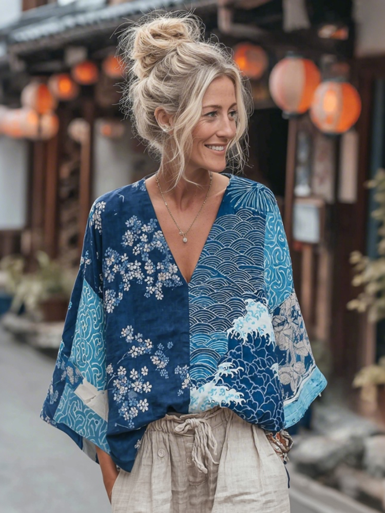 Women's Vintage Japanese Traditional Sashiko And Wave Patchwork Art Print Linen Tops
