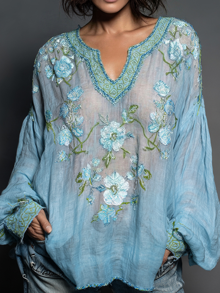 Women's Casual Floral Embroidered Art Print Flowy Linen Blend Tunic